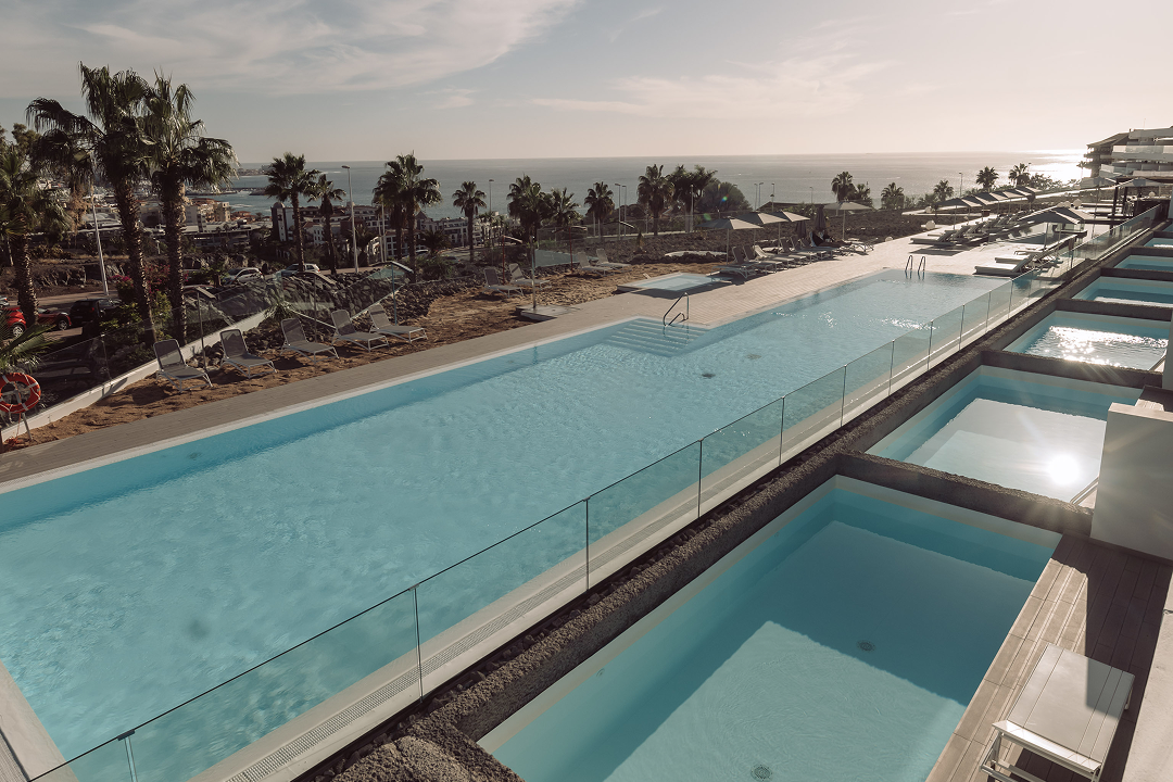 Sonnenschirme und Liegen am Pool mit Meerblick.