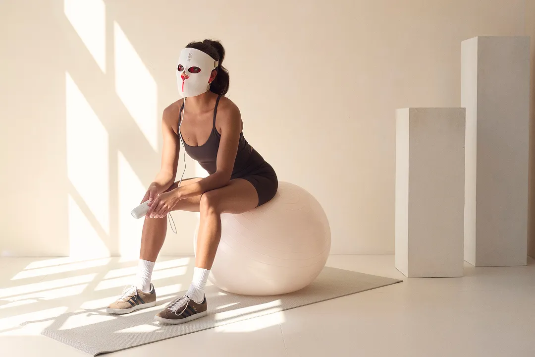 Frau hält eine leuchtende Gesichtsmaske mit roten Lichtern.
